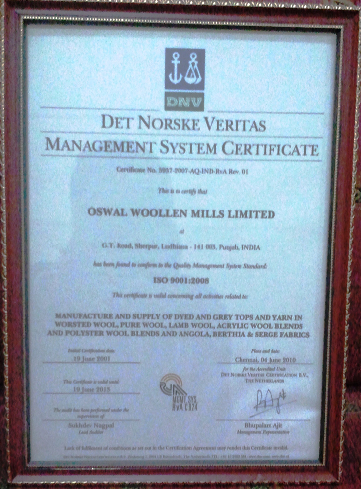 The Quality Management System of our Company has been certified to conform to the Quality Management System Standard: ISO 9001:2008 by DNV Certification B.V., the Netherlands for the manufacture and supply of dyed and grey tops and yarn in worsted wool, pure wool, lamb wool, acrylic wool blends and polyester wool blends and Angola, berthia and serge fabrics. The original certificate was valid from June 19, 2001 to June 19, 2004, which has been further extended till June 19, 2007.